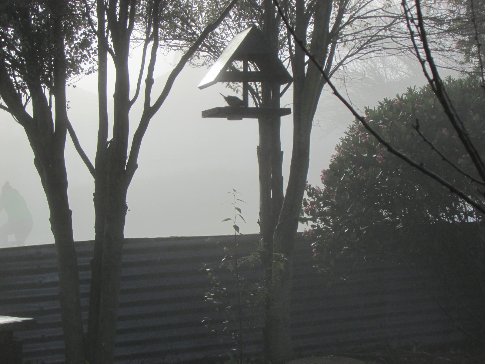 | Foggy day. Bird on the feeder