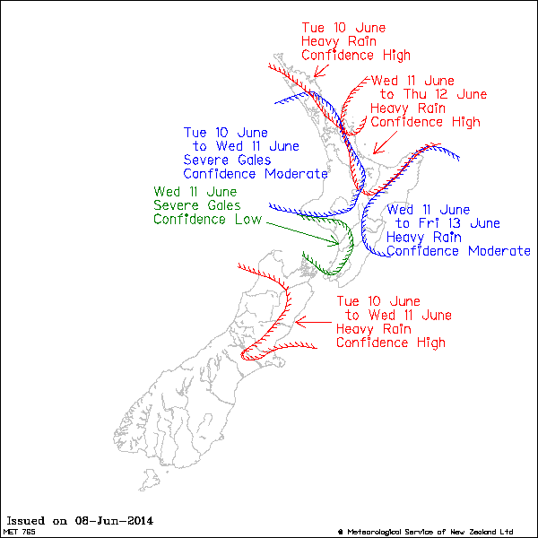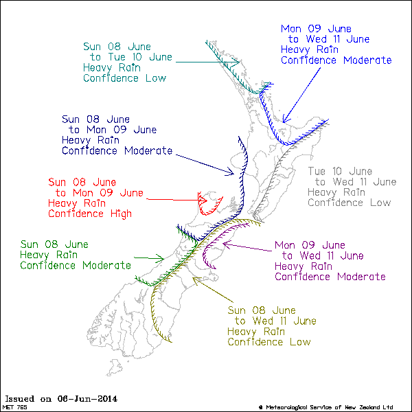 From the Metservice:A complex low is forecast to move towards New Zealand on Sunday, with an associated frontal rainband slowly extending onto northern and central parts of the country. The complex low is then expected to become slow moving over New Zealand through much of next week, bringing widespread unsettled weather. The track of this complex low as well as the progression of the front are still uncertain and will determine the location and duration of any heavy rain.