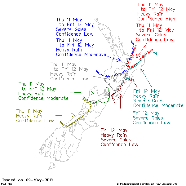 Rain and strong northerlies spread over the North Island during Thursday before the front moves across the Island on Friday and eventually away to the east. During Thursday and Friday, there is low confidence of warning amounts of rain for Wanganui, Manawatu and Horowhenua Kapiti Coast, moderate confidence of warnable rain amounts over the upper North Island, while there is high confidence eastern Bay of Plenty will require a warning for heavy rain, especially about the ranges. In addition, there is low confidence northerlies may rise to severe gale in exposed places during Thursday and Friday, before the front moves away to the east.
