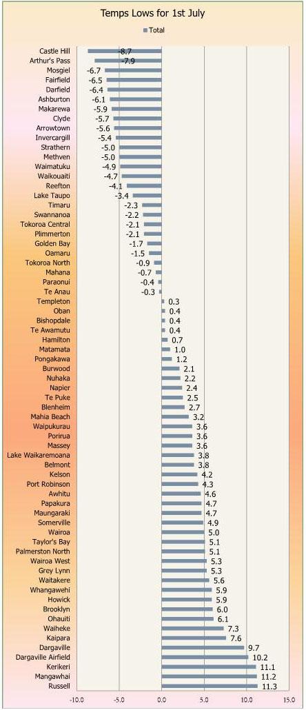 Today's high of 17 degrees was recorded in 3 places - Paihia, Russell, Whangarei.
