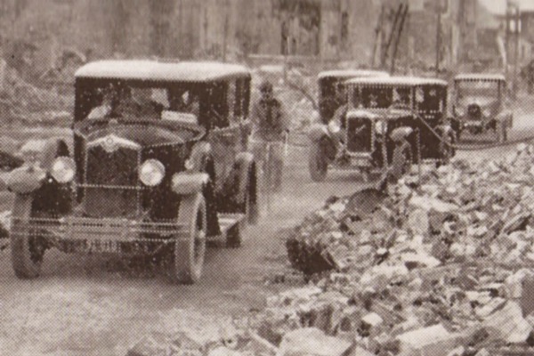 Bigwigs: cars wend their way down a lane cleared through the rubble of the 1931 Napier earthquake in a scene which may resonate with Christchurch people upset that only dignitaries appear to be getting access to the Chch CBD. The caption notes that the lead car carried a (not named) Cabinet Minister. Illustration scanned from the book "the Hawkes Bay Earthquake" by Robert McGregor, first published 1998 by the Art Deco Trust of Napier