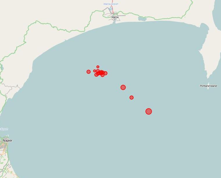 9.24 2.0 S Wairoa - 9.31 2.1 SE Gisborne - 9.41 - 2.4 N Wairoa - 9.44 3.3 S Wairoa - 9.48 2.6 S Wairoa - 10.01 2.4 SW Wairoa - 10.02 2.6 NE Napier - 10.37 2.3 S Wairoa.