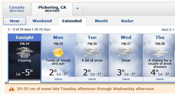 OK, we're 'behind' so here's the Local Weather for SUNDAY, Feb 24 in Pickering/Toronto Canada