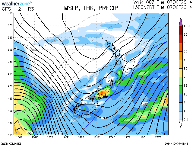 All the South Island, except MarlboroughOccasional showers, some heavy and possibly thundery with hail and snow to 500 metres in the south. Showers clearing overnight and becoming fine in most places. However, rain returning to Fiordland tomorrow afternoon spreading north later.