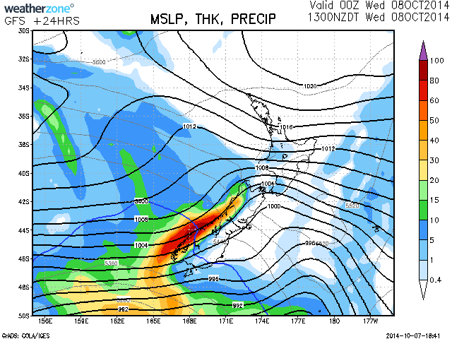 In the west from Waikato to Wellington, including the central high countryRain developing in the south early morning and spreading north during the day, then clearing Wellington and Kapiti towards evening. Severe northerly gales in Wellington this morning.