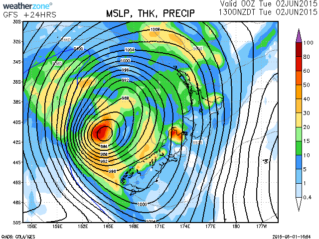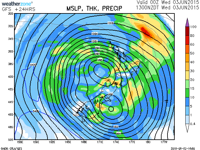 Valid from Monday 1 June 2015 to Thursday 4 June 2015A large low is expected to deepen over the Tasman Sea on Sunday, then approach the country on Monday. There is some uncertainty about the position and movement of this low during the week, but at this stage, the low is expected to spread northerly rain over the country during Monday, Tuesday and early Wednesday. There is a moderate confidence of short duration heavy rain about Northland, Auckland and the Coromandel Peninsula during Monday, with a low confidence about Fiordland and southern Westland. On Tuesday, there is a moderate confidence of heavy rain about most North Island areas from Taranaki to Bay of Plenty northwards, including Nelson, Buller and the Marlborough Sounds, this extends through to Wednesday for places south of Auckland, with a high confidence about the Bay of Plenty.