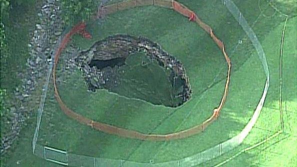 A three-metre sink hole has opened in a golf course in Kansas. Officials at the Canyon Farms golf course in Lenexa said the hazard appeared on the fairway of the 13th hole last Friday after heavy rain. Much of the course is built on top of a disused limestone mine prompting officials to check for further weak spots.