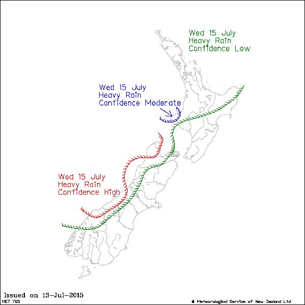 ISSUED BY METSERVICE AT 0904hrs 14-Jul-2015PERIOD OF HEAVY RAIN FOR WESTERN AND NORTHERN PARTS OF THE SOUTH ISLAND, ALSO COROMANDEL PENINSULA AND BAY OF PLENTY. NORTHERLY GALES FOR PARTS OF THE SOUTH ISLAND WEST COAST.