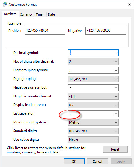 In some cases for the New Zealand region, the list separator has been changed from a comma to a semicolon.