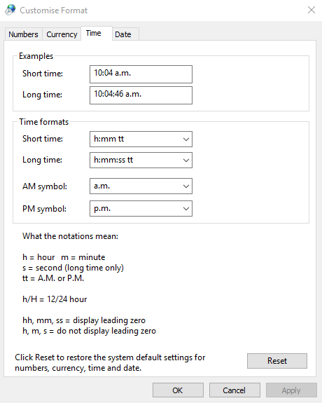 What worked for me was changing the List Separator plus the am & pm settings. So try screenshot 4 and 5 first.