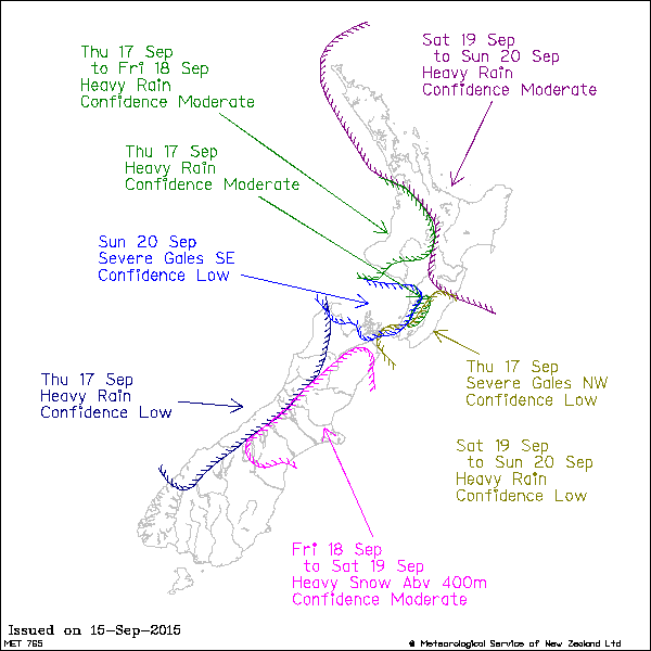 Meanwhile, a low is expected to approach the North Island from the north Tasman Sea during Saturday, with easterlies and rain spreading over the North Island during the weekend. At this stage, the position and depth of this low is fairly uncertain, however, currently the heaviest rain is expected about northern and eastern parts of the North Island. There is a moderate risk of heavy rain about Northland, Auckland, eastern Waikato, Coromandel Peninsula, Bay of Plenty, Gisborne and Hawkes Bay from Saturday to Sunday, and a low risk about Wellington, Wairarapa and the Marlborough Sounds. Easterlies may rise to gale about central parts of New Zealand over the weekend, with a low risk of severe gales about Manawatu, Kapiti Coast, Horowhenua, Marlborough Sounds and western parts of Nelson.