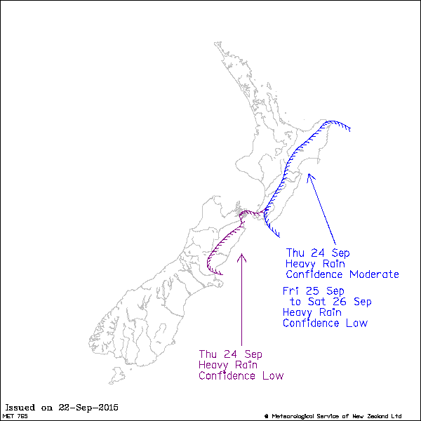 Moist easterlies between these features bring outbreaks of rain to eastern areas from Gisborne to Canterbury for much of the period, and strong to gale southeasterlies to exposed parts of northern and central New Zealand. There is moderate confidence of heavy rain from Gisborne to Wairarapa on Thursday, then a low risk from Friday to Saturday. For eastern parts of Wellington, Marlborough and northern Canterbury there is a low risk of heavy rain on Thursday.