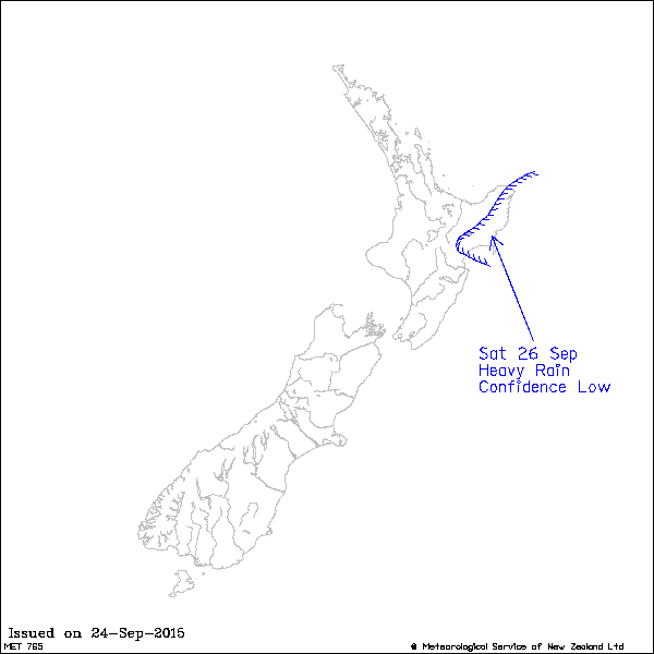 A trough to the northeast of New Zealand and a ridge to the south direct a moist southeasterly flow across the nation on Saturday. This is likely to bring some rain to the east of the North Island. There is a low confidence that rain accumulations will reach warning amounts in Hawkes Bay north of Napier and in Gisborne.