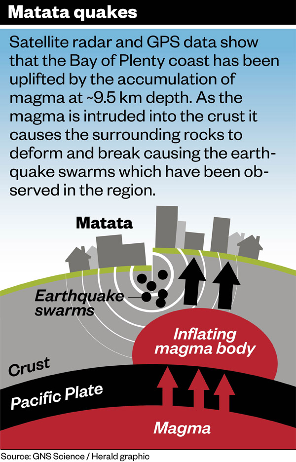 Scientists have found a startling reason for the thousands of quakes that have swarmed around a tiny eastern Bay of Plenty settlement over recent years - a huge magma chamber lying just a few kilometres beneath it.