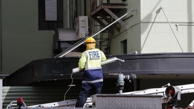 A fireman removes a fallen light from a damaged sign from the New Zealand Post building.