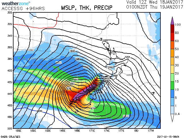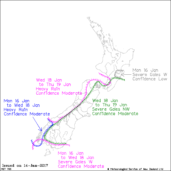 A front should pass over the South Island during Tuesday and weaken as it moves north. Another, more significant front is expected to move onto the lower South Island late Tuesday, then cross much of the South Island on Wednesday and the rest of the country on Thursday. Each of these fronts are expected to bring periods of heavy rain to western areas and strong winds in the east.