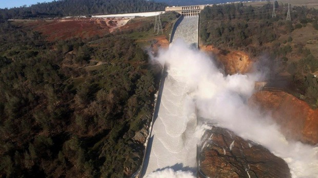 The damaged spillway and eroded hillside are seen in an aerial photo taken over the Oroville Dam. Nearly 200,000 people won't be able to return until the spillway is fixed.
