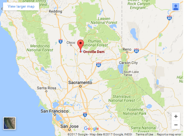 Lake Oroville located about 241km northeast of San Francisco.