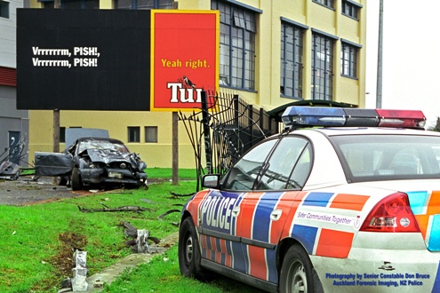 From time-to-time, Police Officers encounter some truly bizarre incidents. This ironic work story started one day when the driver of the offending vehicle was forbidden to drive. Ignoring their ban, they encountered police later that day at a routine checkpoint. In a (significant) error of judgement, the driver decided to flee. A pursuit ensued which lasted less than a minute. The driver lost control and careered through a fence into the billboard. The patrol car was some distance behind the vehicle when it crashed and all police procedures were fully complied with. The driver was not seriously injured but was left with plenty of explaining to do. They made full admissions of responsibility and were convicted on traffic charges relating to the pursuit.